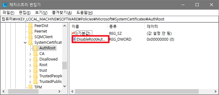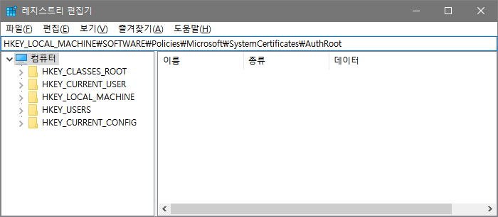 2. 실행된 레지스트리 편집기에서 HKEY_LOCAL_MACHINE\SOFTWARE\Policies\Microsoft\SystemCertificates\AuthRoot 를 찾는다.