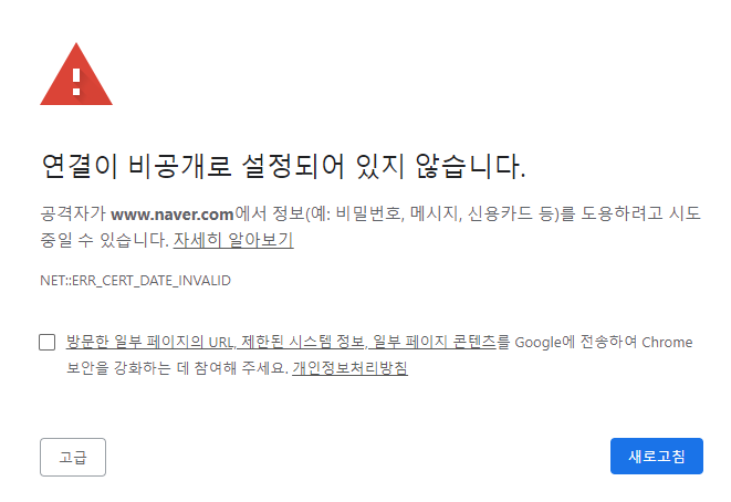 이 오류 메시지는 NET::ERR_CERT_DATE_INVALID로 SSL을 사용중인 많은 사이트들에 접근이 제한된 것이다.