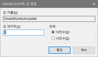 3. DisableRootAutoUpdate 의 값을 0으로 변경한다.