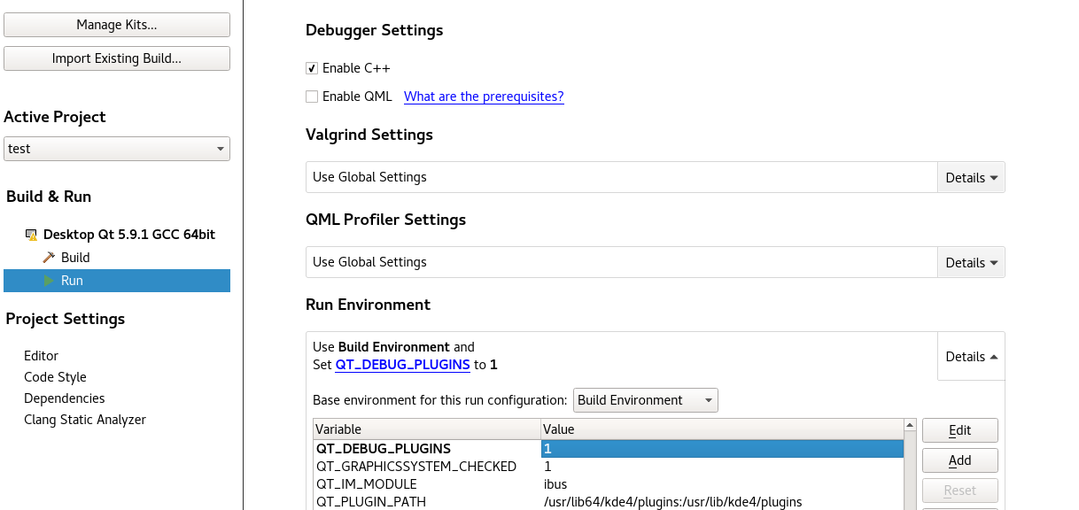 Plugin이 잘 로드되었는지 확인하기 위해선, 아래 사진과 같이 Run Environment에 QT_DEBUG_PLUGINS 를 1로 설정한다.